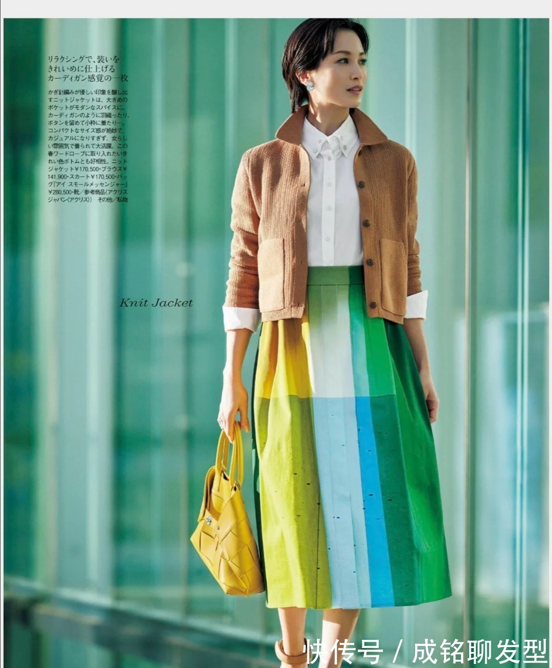 这一套穿搭,相信很多四十岁的女性都会有一些心动,外套和衬衫的匹配很大气,让着装不会花哨,但下半身的裙装却是一大亮点所在。虽然采用的色系很多很丰富,但彼此之间的排列规矩整齐,就能让整套造型渲染出生动的气息。