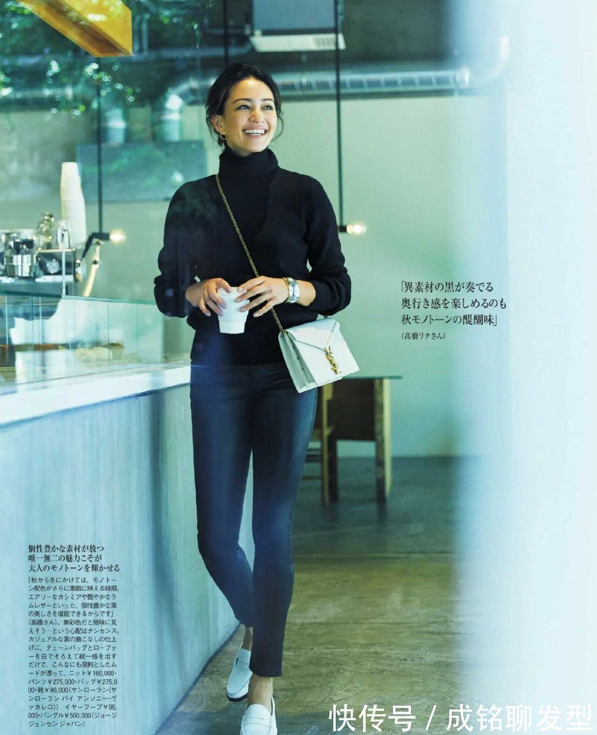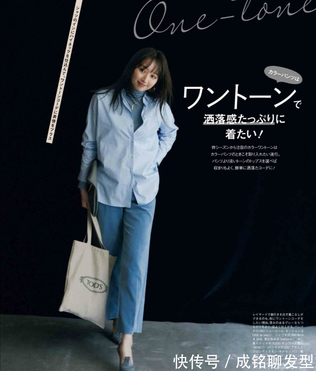 例如这件浅蓝色的衬衫,和白色相比,它所呈现出来的干练感自然不会浓郁,里面驾驭一件色彩很大众的高领衫,把纽扣解开来,看起来就会随性很多。这种穿搭模式依然不会呈现出臃肿感,两类单品的选用都很轻盈。