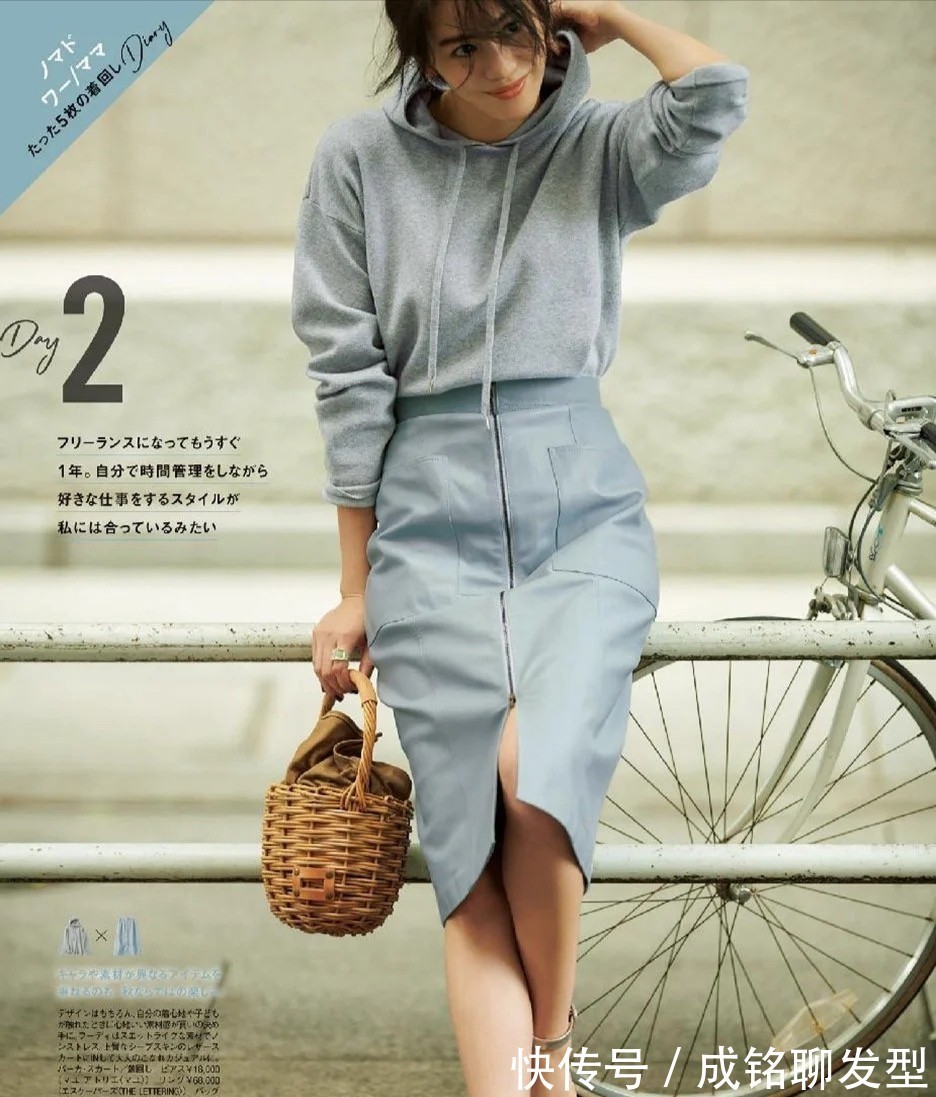 一条灰色包臀裙,展现出了优越的下半身的比例和线条,它是很有女人味的存在,即使颜色中性,也没有弱化丝毫的女性魅力。结合设计简约的连帽卫衣以后,这两类单品就能形成风格上面的中和,状态更松弛,但又凸显了身材。